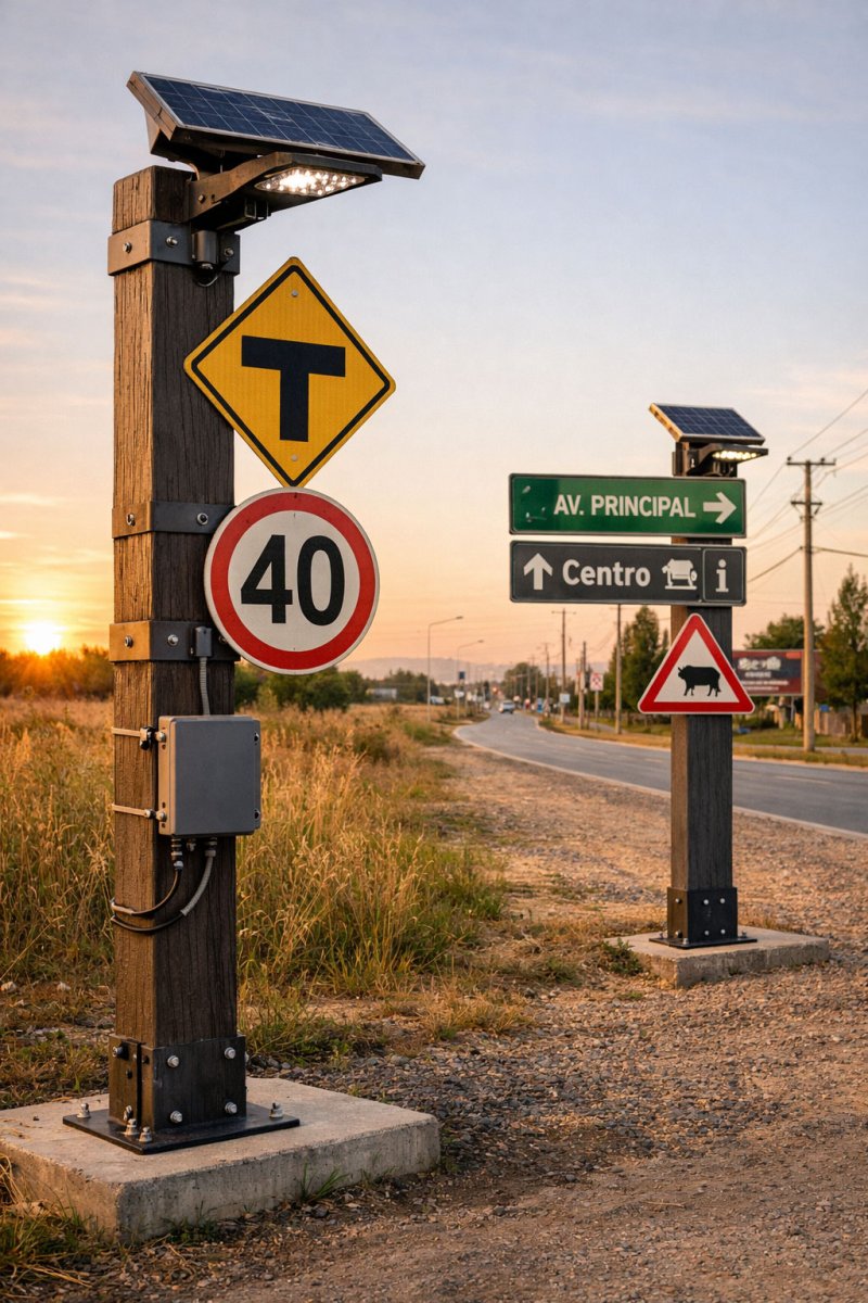 Postes para cartelería, soportes y delimitaciones en entornos rurales y urbanos.